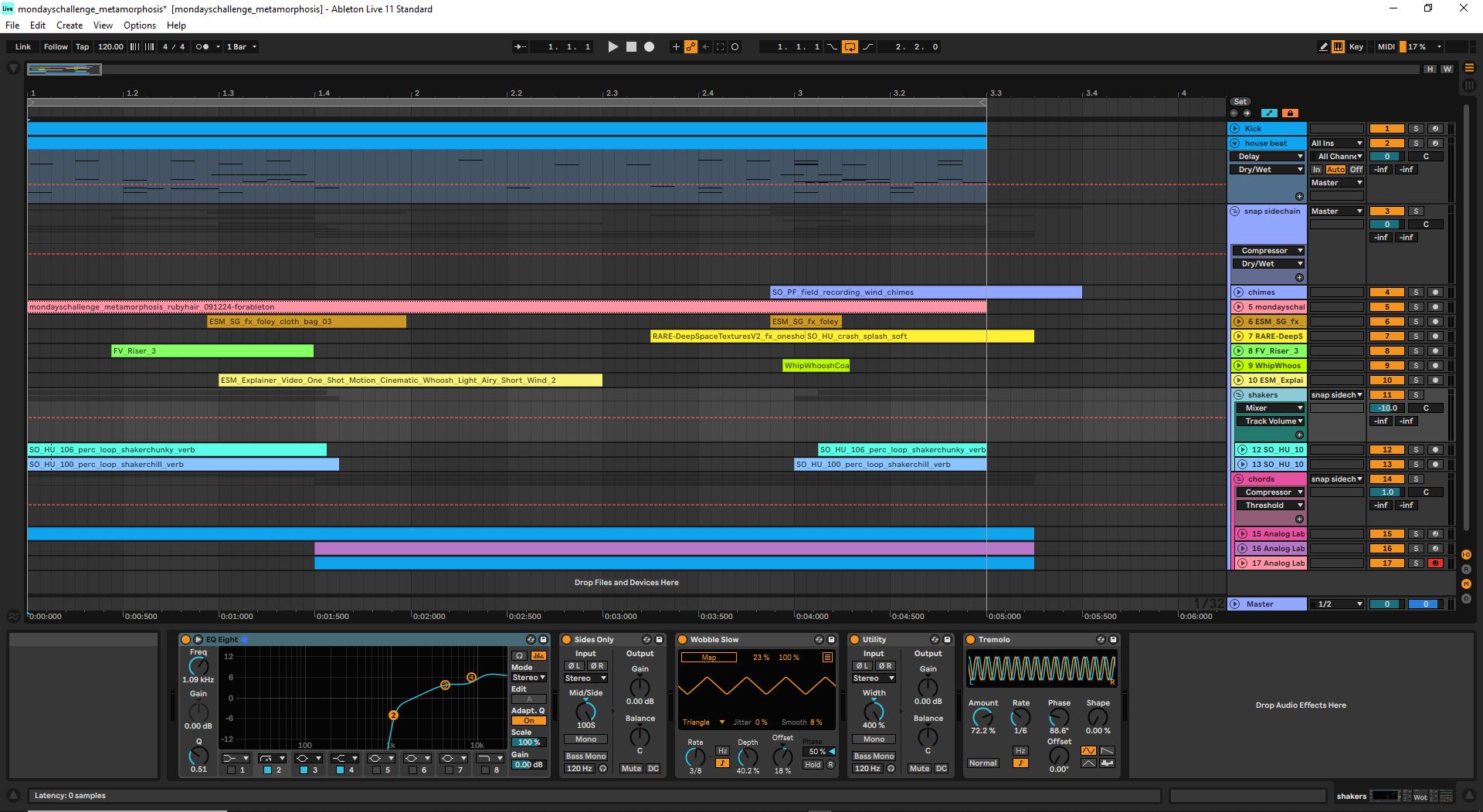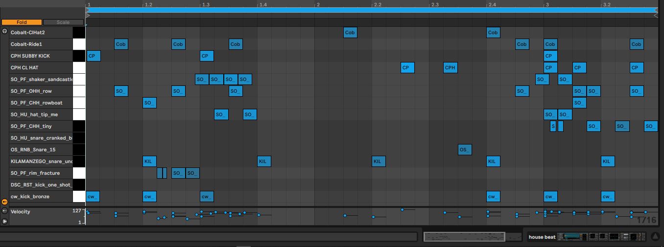 A dynamic music-driven component felt like a good match for Ruby’s dynamic and colorful personality. In Ableton Live, I laid out a bouncy house beat with a subby kick for weight, genre-characteristic cymbals on the backbeat, and rolled percussion elements that move as one. Mystical chords and sparkly arpeggios are layered with shakers to match the shaking motion and add an element of magic. The drums drop out when the fur is expelled, leaving a tone that resonates with delay. The textured percussion enters again as the action continues while risers help build anticipation to the fur poof.